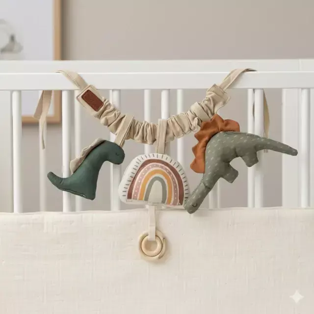 Sonajeros colgantes para el cochecito o cuna. Contiene sonido sonajero (cascabel/cajita sonajero y papel) para que tu bebé explore. Vienen presentados en una tira de elástico forrada adaptable a cualquier medida de barral de cochecito y también podés atarlo al lateral de la cuna. Es ideal para bebés que ya se sientan solitos y solitas.